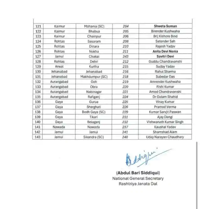 RJD Final candidates list 2025: राष्ट्रीय जनता दल (राजद) ने अपने उम्मीदवारों की फाइनल सूची जारी कर दी है। राजद ने कुल 143 सीटों पर अपने प्रत्याशियों को चुनावी सिंबल सौंपा है।