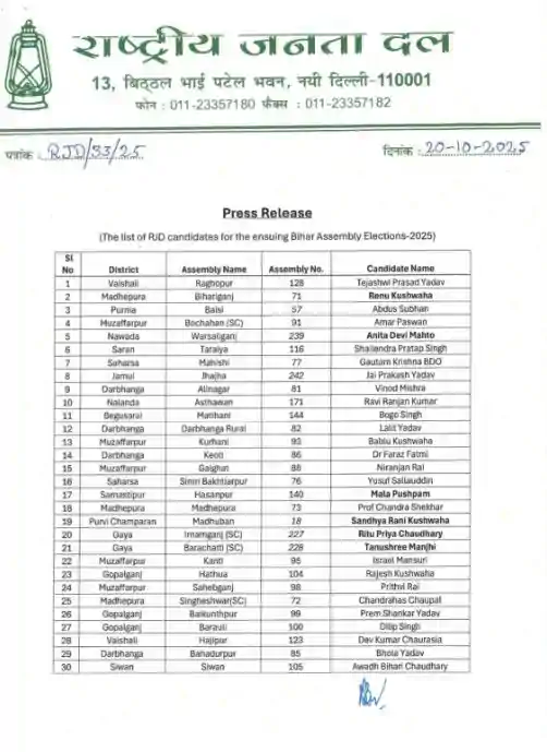 RJD Final candidates list 2025: राजद ने जारी की 143 प्रत्याशियों की फाइनल सूची , देखिए लिस्ट , महागठबंधन में सीट बंटवारे का संकट