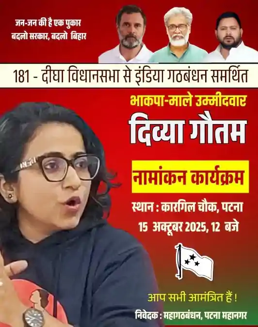 सूत्रों की मानें तो बॉलीवुड के दिवंगत अभिनेता सुशांत सिंह राजपूत की ममेरी बहन दिव्या गौतम इस बार बिहार विधानसभा चुनाव में अपनी किस्मत आजमाने जा रही हैं। कथित तौर पर उन्हें भाकपा (माले) यानी CPIML की ओर से पटना जिले की दीघा विधानसभा सीट से उम्मीदवार बनाया गया है। जानकारी के मुताबिक, दिव्या गौतम 15 अक्टूबर को नामांकन दाखिल करेंगी। उनका चुनावी पोस्टर सोशल मीडिया पर वायरल हो चुका है।