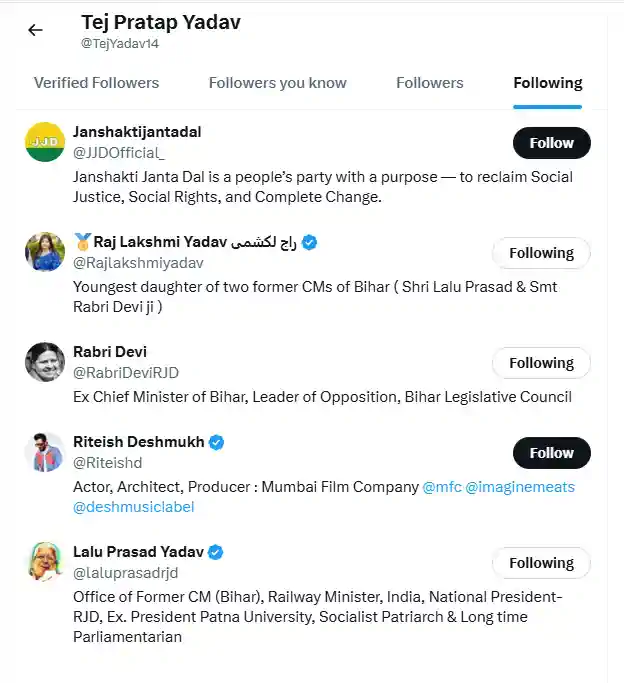 दरअसल, तेज प्रताप को जब लालू यादव ने पार्टी और परिवार से 6 सालों के लिए निष्कासित किया था तो निष्कासन के कुछ ही दिनों बाद उन्होंने अपने सोशल मीडिया से पार्टी सहित परिवार के सभी सदस्यों को अनफॉलो कर दिया। हालांकि वो राजद सुप्रीमो लालू यादव, पूर्व मुख्यमंत्री राबड़ी देवी और नेता प्रतिपक्ष तेजस्वी यादव को फॉलो कर रहे हैं। इसके साथ ही वो अपनी बहन राज लक्ष्मी यादव और रितेश देशमुख को भी फॉलो कर रहे थे। लेकिन अब उन्होंने तेजस्वी को अनफॉलो कर दिया है।