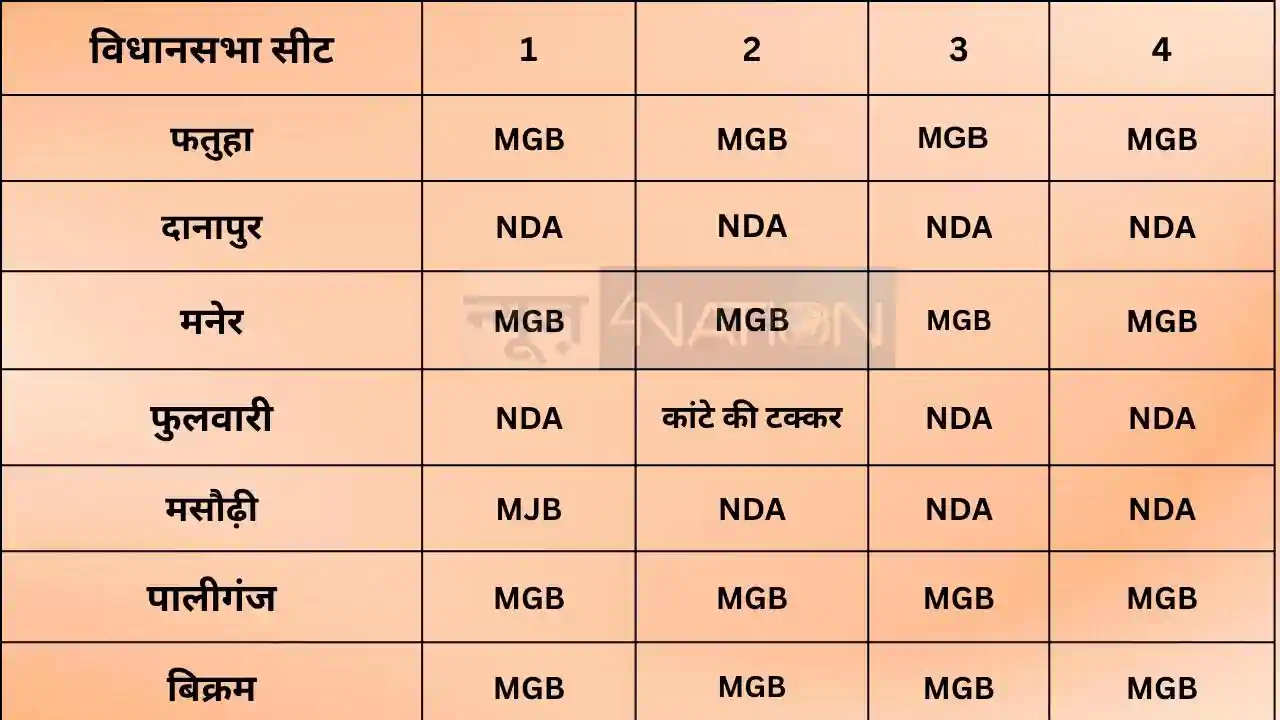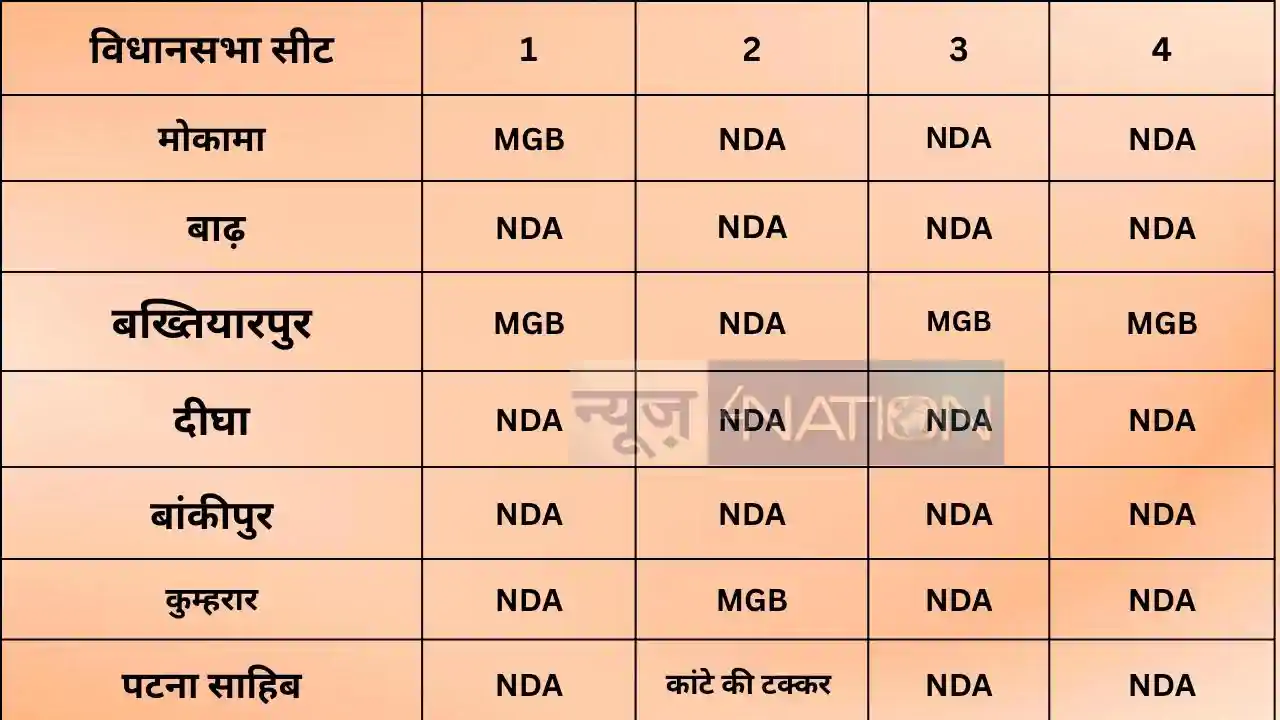 पटना में 14 विधानसभा सीटें हैं। इन सीटों पर पहले चरण में 6 नवंबर को मतदान हुआ। 14 विधानसभा सीटों में मोकामा, बाढ़, बख्तियारपुर, दीघा, बांकीपुर, कुम्हरार, पटना साहिब, फतुहा, दानापुर, मनेर, फुलवारी, मसौढ़ी, पालीगंज और बिक्रम शामिल है। इन विधानसभा सीटों पर एनडीए और महागठबंधन में सीधी टक्कर है। इन विधानसभा सीटों पर मुकाबला रोचक माना जा रहा है। कई सीटों पर कांटे की टक्कर देखने को मिल रही है। वर्ष 2020 के विधानसभा चुनाव में एनडीए के मुकाबले महागठबंधन अधिक सीट जीतने में सफल रहा। वहीं 2020 के मुकाबले 2025 चुनाव में एग्जिट पोल अलग संदेश दे रहा है।