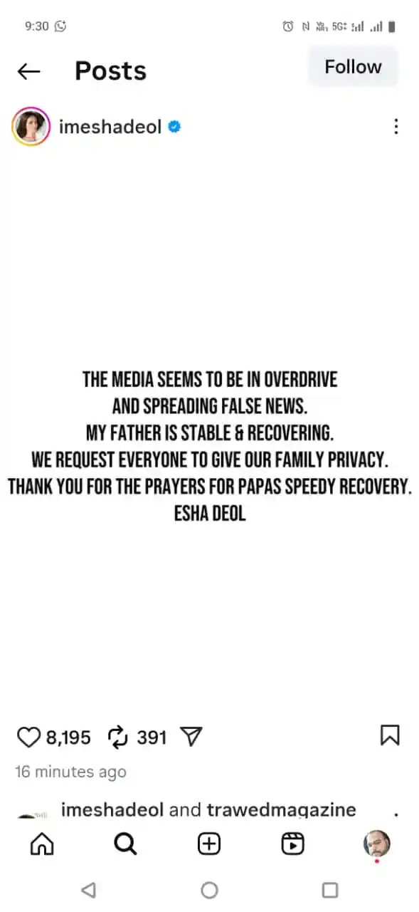 Actor Dharmendra :ईशा देओल ने सोशल मीडिया पर ट्विट कर लिखा कि,'मेरे पिताजी की हालत स्थिर है और उनकी हालत में सुधार हो रहा है। बता दें कि धर्मेंद्र के निधन की खबरें लगातार वायरल हो रही है...