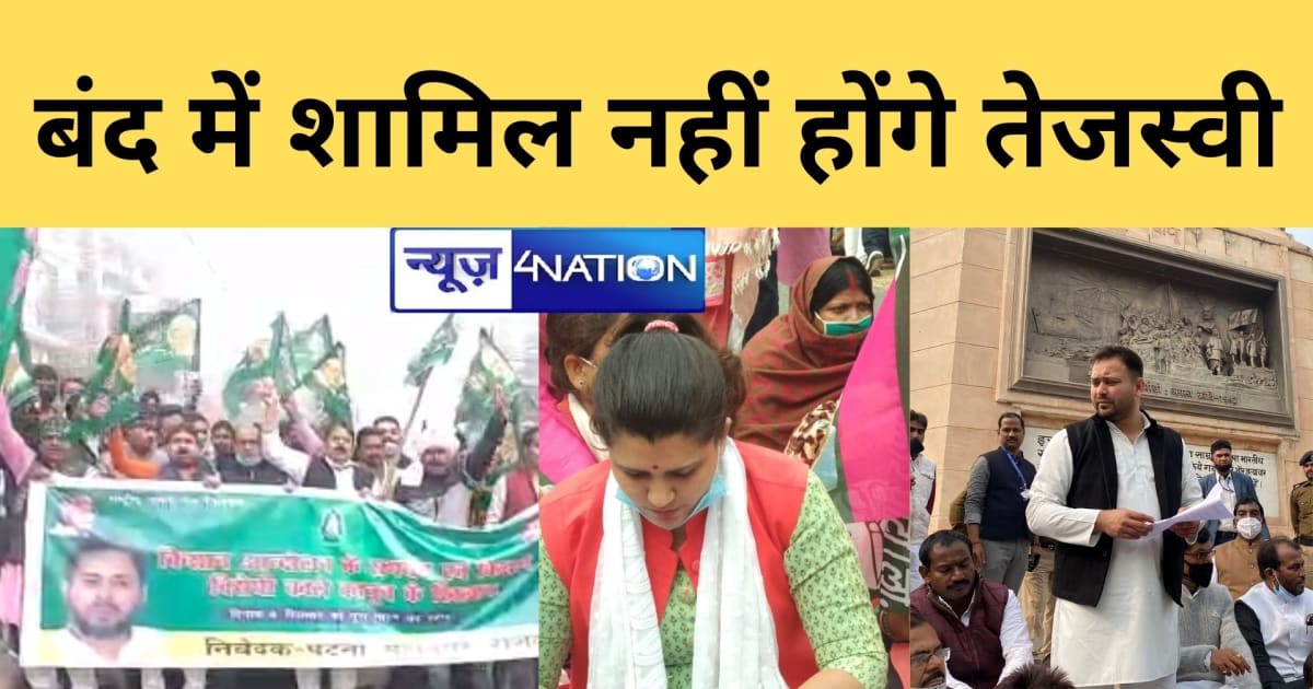 जानकारी के अनुसार,तेजस्वी यादव पटना में नहीं हैं. लिहाजा उनके भारत बंद में शामिल होने की संभावना न के बराबर है।बताया जाता है कि वे दिल्ली में हैं और अभी तक पटना वापस नहीं लौटे हैं.लिहाजा भारत बंद में राजद के नेता ही शामिल नहीं होंगे। तेजस्वी यादव के भारत बंद में सड़क पर नहीं उतरने से राजद कार्यकर्ता अब मायूस होने लगे हैं. राजद नेताओं को बताया गया था कि तेजस्वी यादव भी सड़कों पर उतरेंगे ।दोपहर 12 बजे तक राजद के कार्यकर्ता इस आस में थे तेजस्वी यादव मैदान में उतरेंगे,लेकिन ऐसा नहीं हो सका।