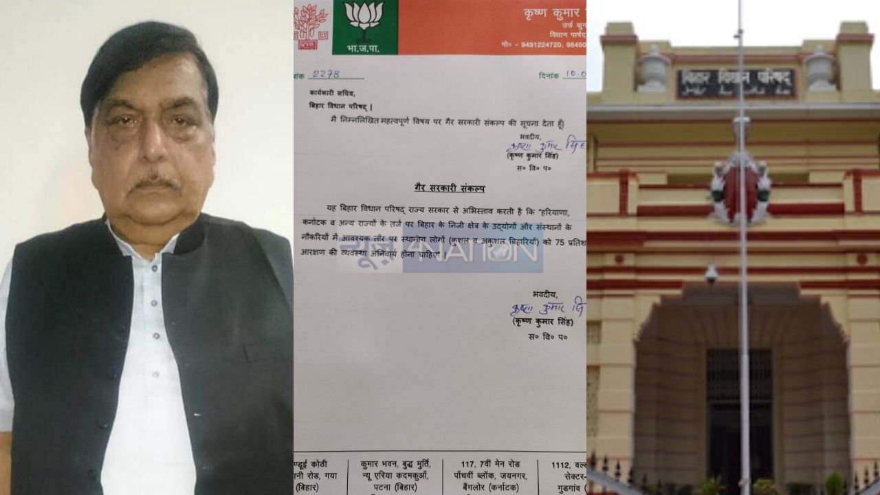 बीजेपी के विधान पार्षद कृष्ण कुमार सिंह बिहार विधान परिषद के कार्यकारी सचिव को बेहद ही महत्वपूर्ण विषय पर गैर सरकारी संकल्प की सूचना दी है. बीजेपी विधान पार्षद कृष्ण कुमार से ने गैर सरकारी संकल्प के तहत यह सवाल पूछा है कि क्या हरियाणा कर्नाटक व अन्य राज्यों की तर्ज पर बिहार के निजी क्षेत्र के उद्योगों और संस्थानों की नौकरियों में आवश्यक तौर पर स्थानीय लोगों जिसमें कुशल व अकुशल बिहारी शामिल हैं को 75 फ़ीसदी आरक्षण की व्यवस्था अनिवार्य करेंगे?