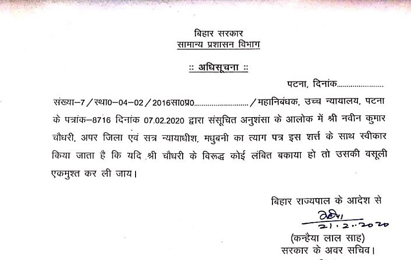 महा निबंधक की अनुशंसा के आलोक में सामान्य प्रशासन विभाग ने नवीन कुमार चौधरी अपर जिला एवं सत्र न्यायाधीश मधुबनी का त्यागपत्र स्वीकार करते हुए इसकी अधिसूचना जारी कर दी है.