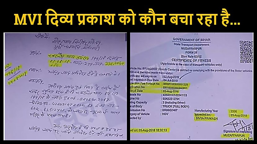दरअसल ये मामला मुजफ्फरपुर के मोटरयान निरीक्षक (MVI) दिव्य प्रकाश से जुड़ा है। MVI ने सारे नियमों की अनदेखी कर एक ऐसे ट्रक का फिटनेस सर्टिफिकेट जारी कर दिया जिसे मोतिहारी जिले के रक्सौल थाने ने 1 अगस्त 2018 से ही जब्त कर रखा है। MVI साहब दिव्य प्रकाश ने गाड़ी संख्या BR06G 2467 का फिटनेस सर्टिफिकेट पुलिस द्वारा जब्त किए जाने के बाद जारी किया। रक्सौल पुलिस ने जिस ट्रक को 1 अगस्त 2018 को जब्त किया, मुजफ्फरपुर MVI ने उसके दो दिन बाद यानी 3 अगस्त 2018 को उसी ट्रक का फिटनेस दे दिया।