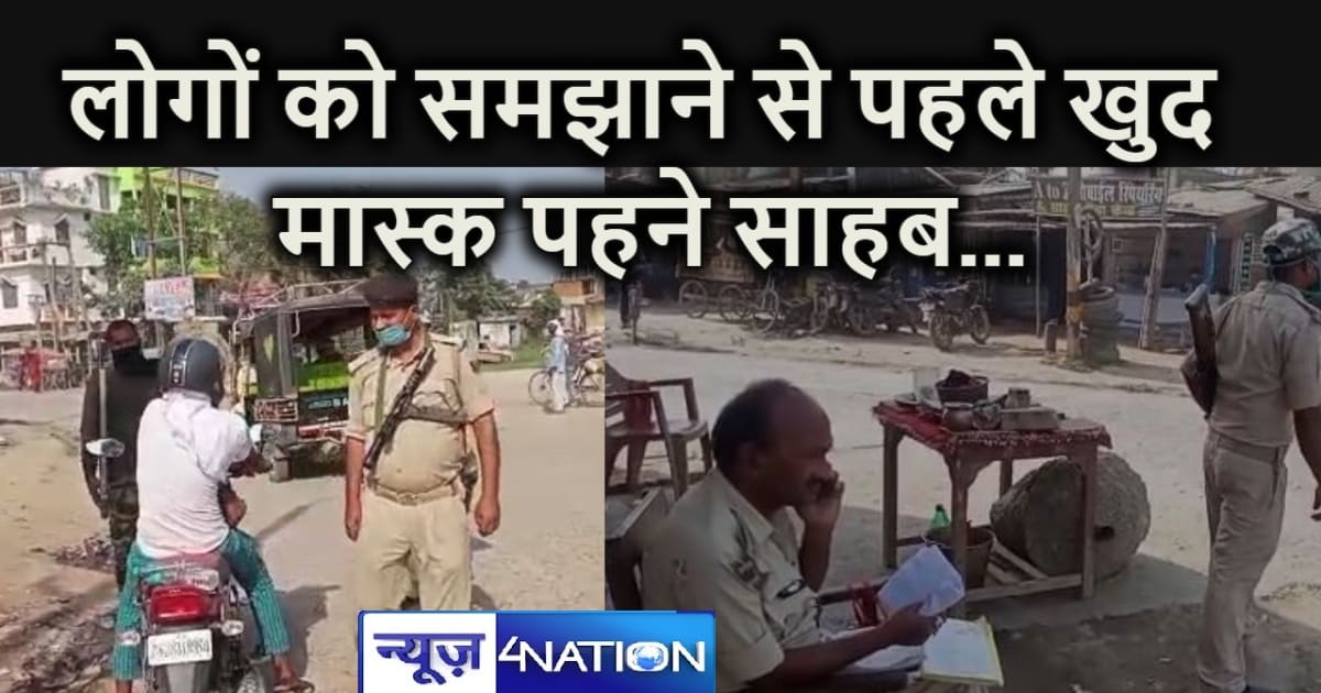 आप इस वीडियो में देख रहे हैं कि एस आई महानंद चौधरी एवं आषुतोष कुमार बिना मास्क पहने दुसरे को मास्क पहने का पाठ पढ़ा रहे हैं। इन लोगों के अनुसार हां मैं बेलदौर पुलिस हूं मास्क नहीं पहनता हूं। देखता हूं मेरा चालान कौन काटता है। यह बात आपको सुनने में अटपटा जरूर लगता होगा लेकिन मामला बिल्कुल सही और सत्य है। जानकारी के मुताबिक खगड़िया एसपी के निर्देश पर बेलदौर थाना में पदस्थापित एसआई चितरंजन प्रसाद सिंह बेलदौर थाना अध्यक्ष के देखरेख में,बेलदौर थाना के सामने बजरंगबली स्थान के नजदीक शनिवार को वाहन चालकों एवं रास्ते चल रहे राहगीर जो मास्क नहीं पहने हुए थे उनका चालान काट रहे थे।लेकिन चालान काट रहे एसआई चितरंजन प्रसाद सिंह खुद मास्क नहीं पहने हुए थे। लेकिन दूसरे व्यक्ति को मास्क पहनने के लिए जरूर हिदायत देते हुए देखा गया। वही इस बात की जानकारी दर्जनों ग्रामीणों ने मीडिया वाले को दिया तो मीडिया की टीम जब बेलदौर थाना के आगे बजरंगबली स्थान के नजदीक गए तो देखे कि वास्तव में एसआई चितरंजन प्रसाद सिंह बिना मास्क पहने कुर्सी पर बैठकर बेहिचक बिना मास्क पहने हुए व्यक्ति का चालान काट रहे थे। जब उनसे पूछा गया कि आप मास्क क्यों नहीं पहने हैं तो उन्होंने बताया कि मेरे पास मास्क है लेकिन पहनकर नहीं हूं।