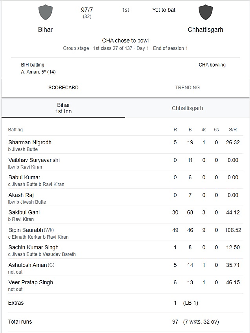रणजी ट्रॉफी में बिहार का फिसड्डी प्रदर्शन बरकरार, छतीसगढ़ के खिलाफ पहले ही सेशन में बुरी तरह पिट गई टीम