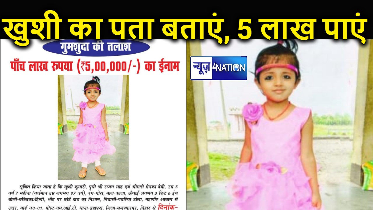 MUZAFFARPUR: मुजफ्फरपुर से 22 महीने से लापता खुशी कुमारी का पता बताने वाले को अब सीबीआई 5 लाख का इनाम देगी। दरअसल, 16 फरवरी 2021 को मुजफ्फरपुर के ब्रहमपुरा थाना क्षेत्र के वार्ड संख्या एक से राजन साह की 5 वर्ष 7 महीने की पुत्री खुशी कुमारी अचानक अपने आवास से लापता हो गई थी। जिसके बाद लापता खुशी के परीजनों ने ब्रह्मपुरा थाना में पूरे मामले को लेकर प्राथमिकी दर्ज कराई थी। लेकीन पुलिस को मामले में किसी तरह कोई कामयाबी हाथ नहीं लगी।