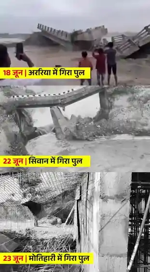 बिहार में पुलों के गिरने का सिलसिला थम नहीं रहा है। रविवार को एक बार फिर से एक निर्माणाधीन पुल गिर गया है। इस तरह पिछले एक सप्ताह में बिहार में तीसरी बार पुल गिरने का हादसा हुआ है। इस बार मोतिहारी में पुल ध्वस्त हुआ है। मोतिहारी के घोड़ासहन प्रखंड में निर्माणाधीन पुल ध्वस्त हुआ है। करीब डेढ़ करोड़ की लागत से पुल बन रहा था। प्रधानमंत्री ग्राम सड़क योजना से इस पुल का निर्माण हो रहा था। आरसीसी पुल का निर्माण धीरेंद्र कंस्ट्रक्शन प्रा. लिमिटेड श्रीकृष्णनगर द्वारा कराया जा रहा था।
