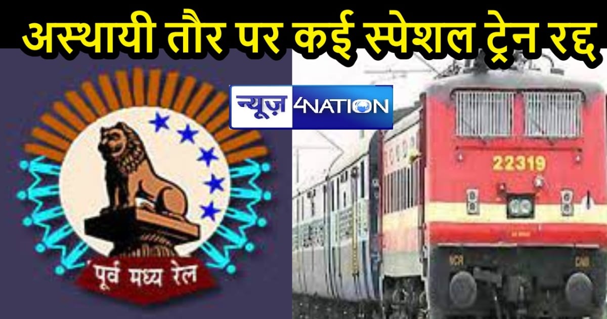 • 08450 पटना-पुरी स्पेशल ट्रेन का परिचालन 26 मई को रद्द रहेगा।