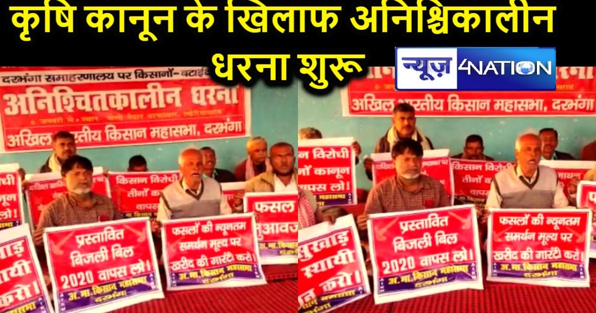 दरभंगा... दरभंगा भाकपा माले से सम्बद्ध अखिल भारतीय किसान महासभा के जिला परिषद के नेतृत्व में समाहरणालय पर दिन रात का धरना शुरू हुआ है धरना का नेतृत्व किसान महासभा के जिलाध्यक्ष शिवन यादव और सचिव प्रवीण यादव कर रहे हैं।धरनाथियों की मांगे हैं कि केंद्र सरकार की तीनों किसान विरोधी कानून, पराली जलाने पर दण्ड और विजली महंगी करने का विल वापस हो, न्यूनतम समर्थन मूल्य और सरकारी मंडी को कानूनी दर्जा दिया जाय, बाढ़ ओला वृष्टि से हुई फसल क्षति का मुआवजा,सभी बन्द मिल को चालू करने ,बाढ़ का स्थायी निदान करने, कैम्प लगाकर दाखिल खारिज करने की मांग है.