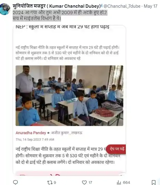 तो वहीं शिक्षा विभाग के एक्स पर पोस्ट पर एक यूजर ने लिखा है -2024 आ गया और तुम अभी 2009 में ही अटके हुए हो.?सच में माइंडलेस विभाग है ये।
