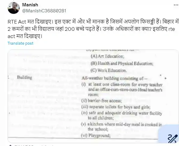 अब इस पर कई लोगों ने टिप्पणी की है. एक यूजर ने शिक्षा विभाग का विरोध करते हुए लिखा है कि RTE Act मत दिखाइए। इस एक्ट में और भी मानक है जिसमें अपलोग फिसड्डी हैं। बिहार में 2 कमरों का भी विद्यालय जहां 200 बच्चे पढ़ते हैं। उनके अधिकारों का क्या? इसलिए rte act मत दिखाइए.