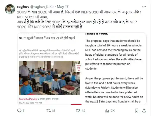 एक यूजर ने लिखा है कि 2009 के बाद 2020 भी आया है, जिसमें एक NEP 2020 भी आया उसके अनुसार -फिर NCF 2023 भी आया, आश्चर्य है कि तर्क के लिए 2009 के दस्तावेज इस्तमाल हो रहे हैं पर उसके बाद के NEP 2020 और NCF 2023 से कोई मतलब नहीं है.