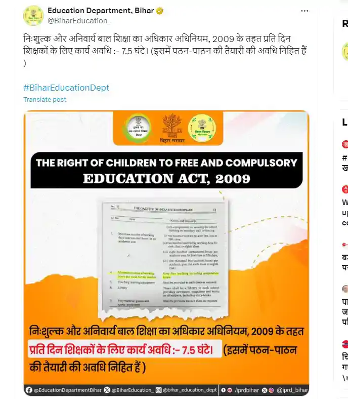 इस पर शिक्षा विभाग ने पोस्ट कर लिखा है कि, "निःशुल्क और अनिवार्य बाल शिक्षा का अधिकार अधिनियम, 2009 के तहत प्रतिदिन शिक्षकों के लिए कार्य अवधि 7.5 घंटे. (इसमें पठन-पाठन की तैयारी की अवधि निहित हैं.''विवाद पर शिक्षा विभाग ने एक पोस्ट के जरिए प्रतिक्रिया दी. विभाग ने साफ किया कि शिक्षा का अधिकार कानून, 2009 के तहत स्कूल में काम करने की अवधि 7.5 घंटे तय है. विभाग के इस जवाब से साफ है कि मुख्य अपर सचिव केके पाठक अपने फैसले पर कायम हैं .