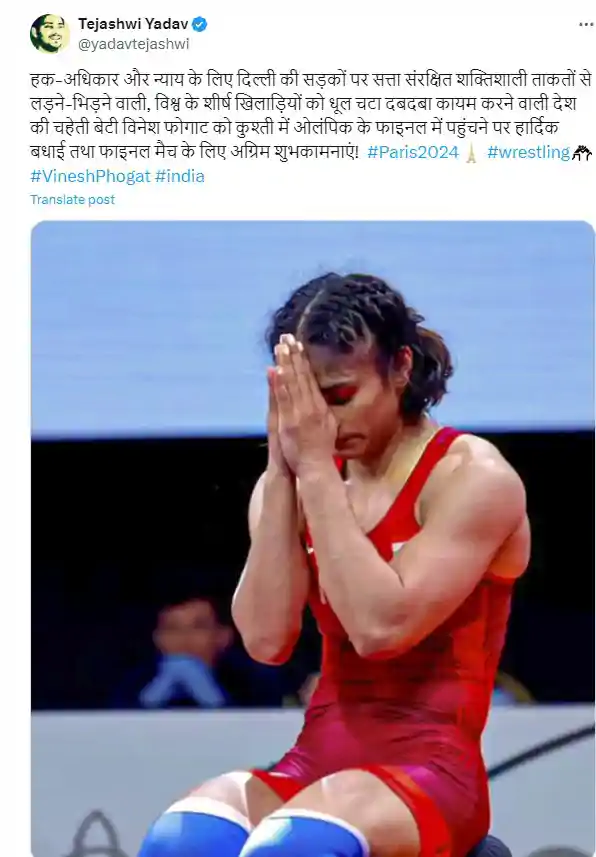 विनेश फोगाट के कमाल पर नेता प्रतिपक्ष तेजस्वी ने दी बधाई, कहा- ...सत्ता संरक्षित शक्तिशाली ताकतों से लड़ने-भिड़ने वाली,..देश की चहेती बेटी ..को हार्दिक शुभकामनाएं