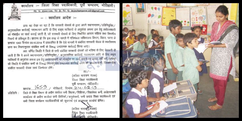 मोतिहारी के जिला शिक्षा पदाधिकारी ने 24 अगस्त को इस संबंध में आदेश जारी कर दिया है।अपने आदेश में डीईओ ललित नारायण रजक ने लिखा है कि यह देखा जा रहा कि सरकारी कर्मी या शिक्षक अपने स्थानांतरण,प्रतिनियुक्ति,अनुशासनिक कार्रवाई,पदस्थापन के लिए बाहरी व्यक्ति से अनुशंसा करा रहे या फोन करवा रहे हैं।