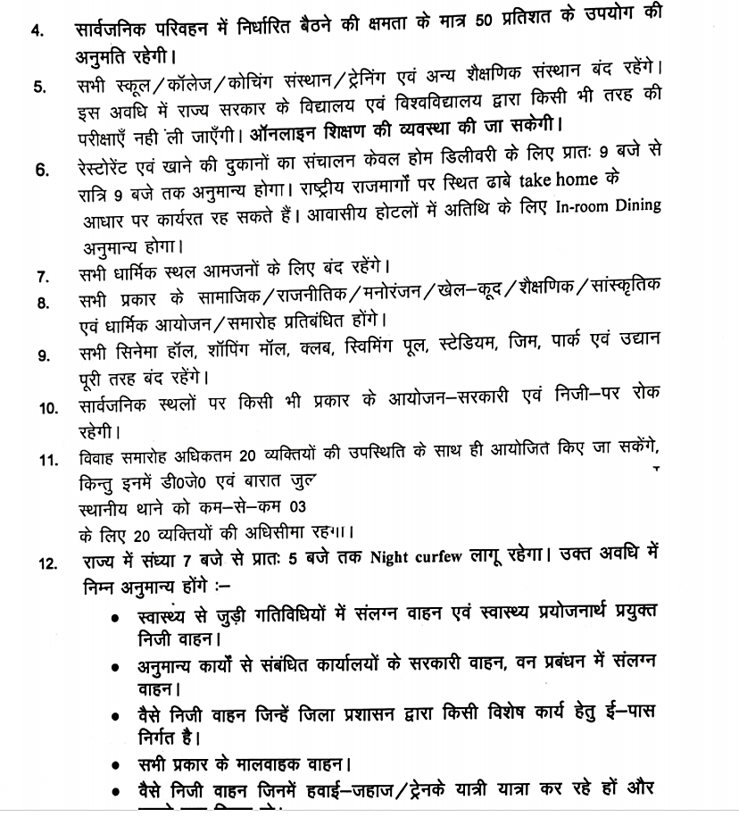 शाम 7:00 बजे से सुबह 5:00 बजे तक नाइट कर्फ्यू लागू रहेगा. इस अवधि में राज्य सरकार ने कई जरूरी गतिविधियों को छूट प्रदान की है. स्वास्थ्य से जुड़ी गतिविधियों में संलग्न वाहन एवं स्वास्थ्य में प्रयुक्त निजी वाहन को छूट मिला है। वहीं जरूरी कार्यों से संबंधित कार्यालयों के सरकारी वाहन, वन प्रबंधन में लगे वाहन, वैसे निजी वाहन जिन्हें जिला प्रशासन द्वारा किसी विशेष कार्य हेतु ईपास निर्गत है, सभी प्रकार के मालवाहक वाहन, वैसे निजी वाहन जिनमें हवाई जहाज ट्रेन के यात्री यात्रा कर रहे हो और उनके पास टिकट हो. ड्यूटी पर जाने को लेकर सरकारी सेवकों एवं अन्य सेवाओं के निजी वाहनों को छूट मिलेगी .अंतर राज्यीय मार्गों पर अन्य राज्यों को जाने वाले निजी वाहन को छूट मिलेगी. निजी वाहनों के परिचालन तथा पैदल आवागमन पर नाइट कर्फ्यू की अवधि को छोड़ कोई प्रतिबंध नहीं होगा. सार्वजनिक एवं निजी वाहनों में सभी के लिए मास्क पहनना अनिवार्य होगा. ऐसा नहीं करने पर कार्रवाई की जाएगी. जिलों के डीएम स्थानीय परिस्थिति की समीक्षा कर इन प्रतिबंधों के अतिरिक्त अधिक सख्त प्रतिबंध लगा सकेंगे. किंतु किसी भी स्थिति में इन प्रतिबंधों को शिथिल नहीं करेंगे. सभी जिला पदाधिकारी वर्णित आदेशों के अनुपालन के लिए दंड प्रक्रिया संहिता की धारा 144 के अंतर्गत निषेधाज्ञा निर्गत करेंगे.