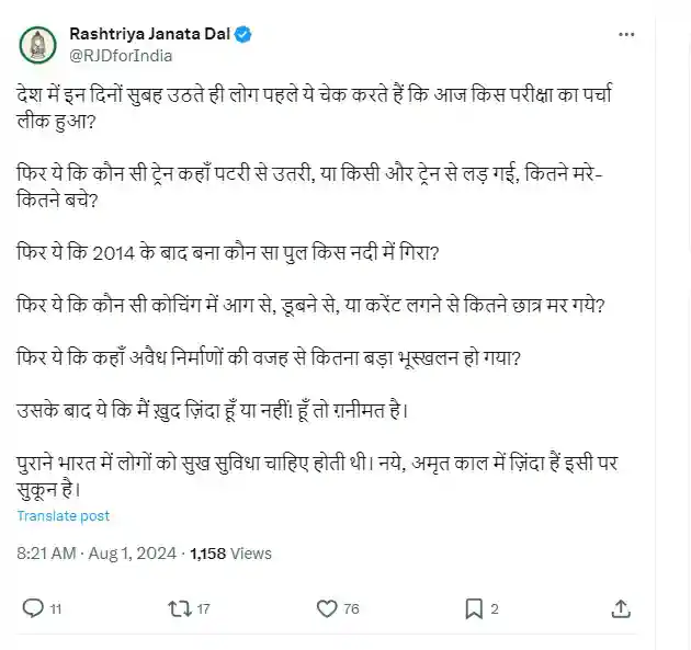 आगे राजद ने पोस्ट कर कहा है कि -फिर ये कि कौन सी ट्रेन कहाँ पटरी से उतरी, या किसी और ट्रेन से लड़ गई, कितने मरे-कितने बचे?