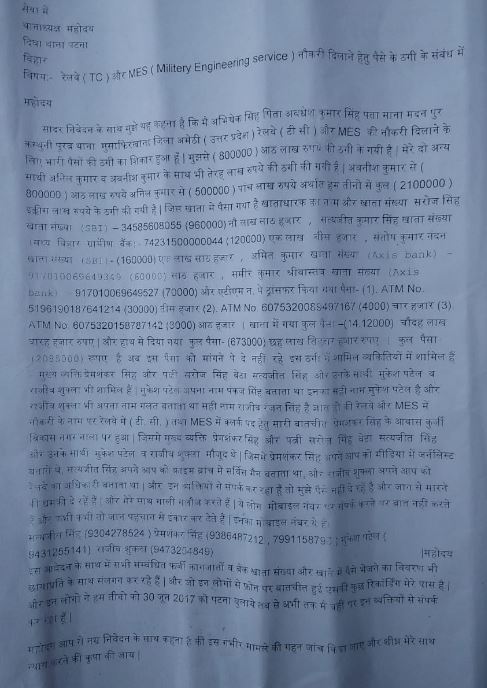 ठगी के शिकार अभिषेक ने बताया कि प्रेम शंकर व उसके बेटे सत्यजीत ने सरकारी नौकरी दिलाने का झांसा देकर हमलोगों से 21 लाख रुपये ठग लिए। 16 लाख रुपये अकाउंट में ट्रांसफर किए गये जबकि 5 लाख रुपये कैश दिए गये थे। पीड़ित अभिषेक ने बताया कि मुझसे और अवनीश से 8 लाख रुपये लिए गये जबकि अनिल ने 5 लाख रुपये दिए हैं।
