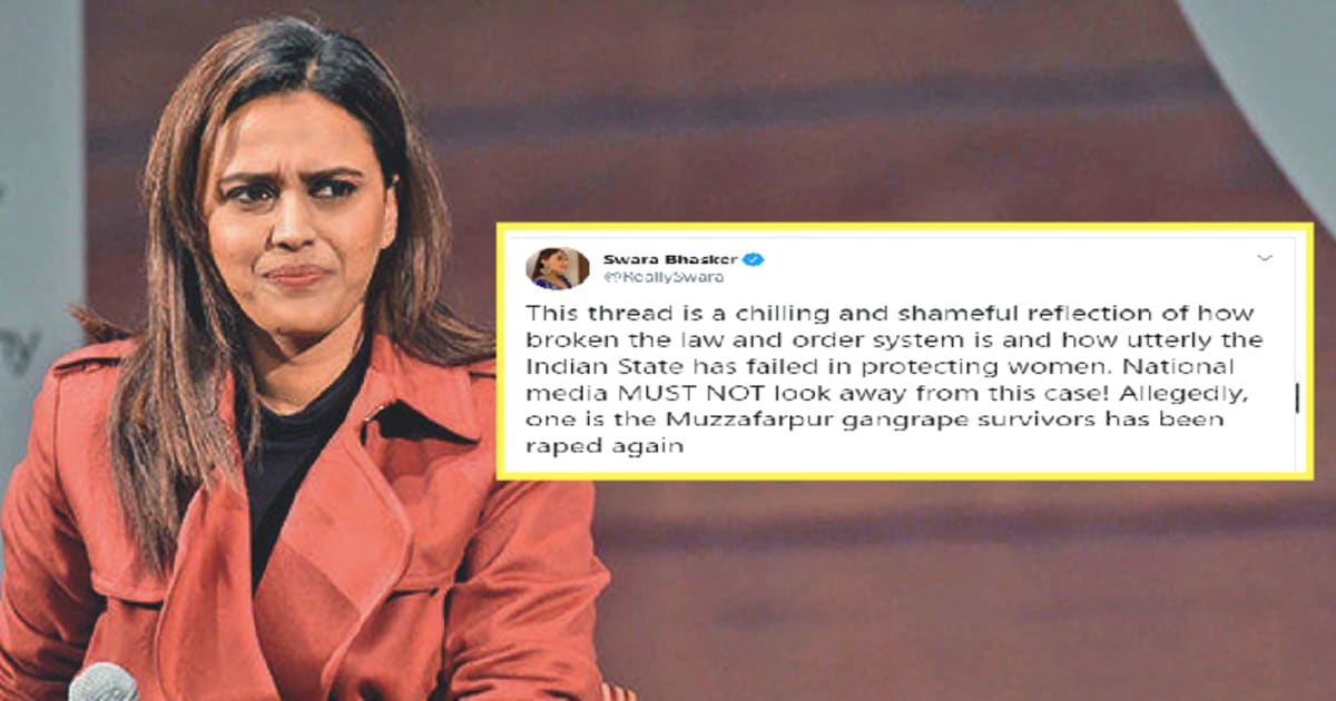मुजफ्फरपुर बालिका गृह कांड पीड़िता के साथ फिर हुआ बलात्कार, स्वरा भास्कर को आया गुस्सा, Tweet कर यूं साधा निशाना