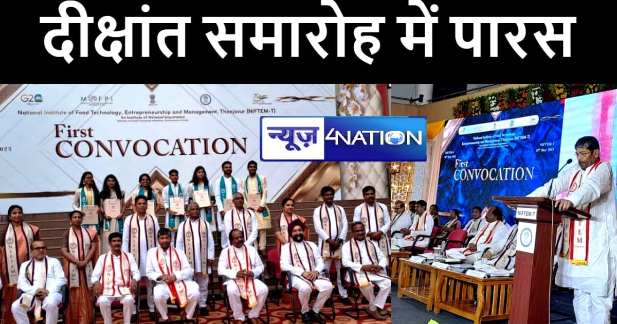 प्रदेश प्रवक्ता चंदन कुमार ने बताया कि केन्द्रीय मंत्री पारस ने आगे कहा कि आप सबको आगे आकर इनोवेशन के साथ फूड प्रोसेसिंग क्षेत्र के विकास के लिए कार्य करना होगा। मैं निफ्टम के सभी छात्रों से अच्छा शोध कार्य करने की अपील करता हूं, जो फूड प्रोसेसिंग क्षेत्र में महत्वपूर्ण योगदान देगा। आज आप लोगों के सामने राष्ट्रीय महत्व का संस्थान के क्रियाकलापों के बीच यह अवसर है कि आप अपने भविष्य की तस्वीर को स्वयं अपने हाथों से लिख सकते हैं। मेरी अपेक्षा है कि संस्थान विश्व पटल पर स्थापित करने में अग्रसर हों। आप सब संस्थान के उद्देश्य में अपने भूमिका सुनिश्चित करें ऐसी मेरी शुभकामना है। मुझे विश्वास है कि खाद्य प्रौद्योगिकी में अर्जित यह विशिष्ट डिग्री निश्चित रूप से छात्रों को हमारे देश के खाद्य उद्योग और खाद्य नियामक कार्यों का समर्थन करने में मदद करेगी तथा हमारे प्रधानमंत्री के द्वारा खाद्य सुरक्षा तथा पोषण सुरक्षा वाले एक मजबूत राष्ट्र के निर्माण हेतु की गई कल्पना को साकार करने में हमारी मदद करेगी। आज दीक्षांत समारोह के अवसर पर वाइस चान्सलर, तमिलनाडु केन्द्रीय विश्वविद्यालय, डाॉ. एम. कृष्णन जी,चेयरमैन, बोर्ड ऑफ गवर्नर्स, निफ्टम तंजावुर, डॉ. आर. एस. सोढ़ी, अपर सचिव, फूड प्रोसेसिंग उद्योग मंत्रालय, मिन्हाज आलम ,निदेशक, निफ्टम तंजावुर लोगनाथन, रजिस्ट्रार, निफ्टम तंजावुर शंमुगसुन्दरम उपस्थित रहे।