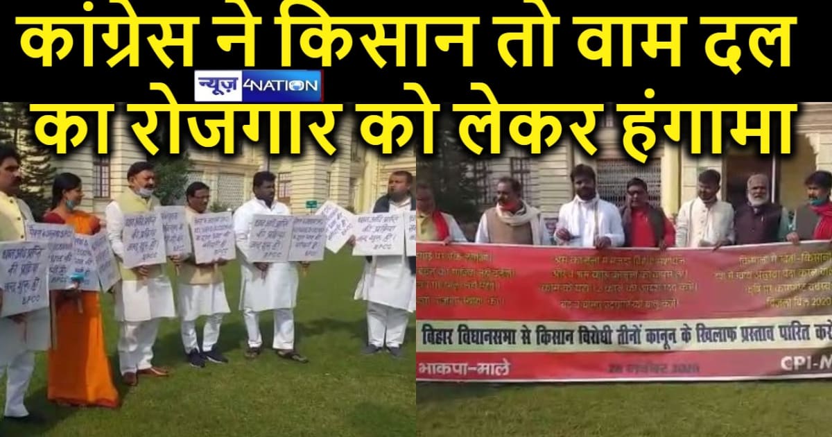 पटना... बिहार विधानसभा का चौथा दिन आज शुरू हो गया। शुरू होने से पहले कांग्रसे और वाम दलों के नेताओं ने विधानसभा परिसर में हंगामा किया। कांग्रेस ने जहां किसानों को धान अधिप्राप्ति की प्रकिया जल्द शुरू करने की मांग कोलेकर हंगामा किया तो वाम दल के नेताओं ने रोजगार के मुद्दे पर सरकार को घेरने की कोशिश की।
