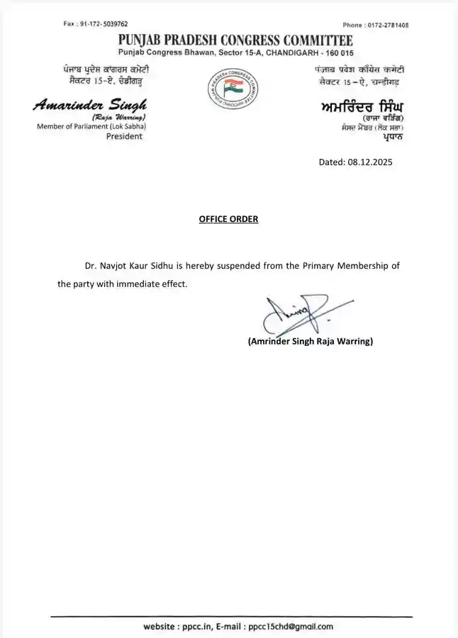 नवजोत कौर के खिलाफ एक्शन की जानकारी पंजाब कांग्रेस अध्यक्ष और लुधियाना से कांग्रेस सांसद अमरिंदर सिंह राजा वडिंग ने अपने सोशल मीडिया हैंडल X पर लेटर भी शेयर कर नवजोत कौर की प्राथमिक सदस्यता फिलहाल सस्पेंड की जाती है.