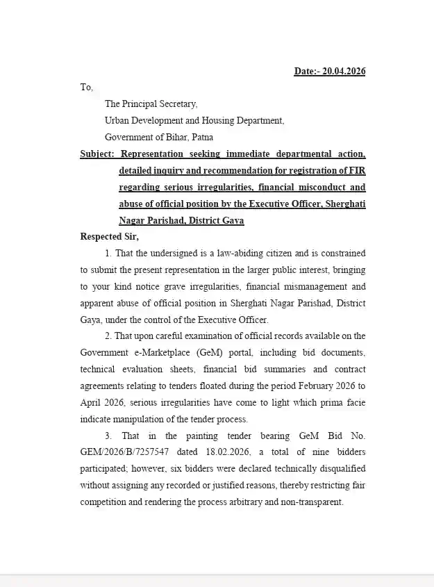 Bihar News: गयाजी जिले के शेरघाटी नगर परिषद से भ्रष्टाचार का एक बड़ा और सनसनीखेज मामला सामने आया है, जिसने स्थानीय सियासत से लेकर प्रशासनिक हलकों तक हलचल मचा दी है। पूर्व मुख्य पार्षद प्रतिनिधि सह भाजपा मीडिया प्रभारी विनय कुमार ने मुख्य पार्षद और कार्यपालक पदाधिकारी पर मिलीभगत कर घोटाले पर घोटाले करने का संगीन आरोप लगाया है। इस पूरे मामले को लेकर उन्होंने बिहार सरकार के नगरीय विकास एवं आवास विभाग के प्रधान सचिव को लिखित शिकायत भेजते हुए तत्काल कार्रवाई की मांग की है।