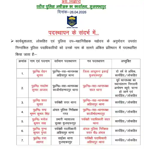 अब देखना दिलचस्प होगा कि ये नए खिलाड़ी अपने-अपने इलाकों में कैसे मोर्चा संभालते हैं और शहर में अमन-चैन कायम रखने में कितने कामयाब साबित होते हैं। फिलहाल, इस तबादले ने साफ कर दिया है मुजफ्फरपुर पुलिस अब एक्शन मोड में है।