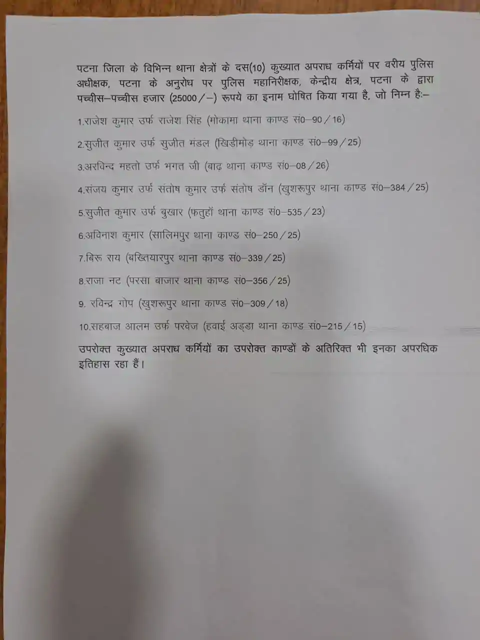 Bihar News: बिहार के नए गृह मंत्री सम्राट चौधरी के आदेश पर बिहार पुलिस एक्शन मोड में है। कुख्यात अपराधियों पर एक के बाद एक पुलिस कार्रवाई जारी है। इसी बीच पटना जिले के विभिन्न थाना क्षेत्रों में सक्रिय अपराधियों के खिलाफ पुलिस ने सख्त रुख अपनाया है। वरिष्ठ पुलिस अधीक्षक (एसएसपी) कार्तिकेय के. शर्मा के अनुरोध पर रेंज आईजी जितेंद्र राणा ने 10 अपराधियों पर 25-25 हजार रुपये का इनाम घोषित किया है। इन सभी के खिलाफ अलग-अलग थानों में कई मामले दर्ज हैं और ये अन्य गंभीर कांडों में भी वांछित बताए जा रहे हैं। इनमें से कुछ अपराधियों का लंबा आपराधिक इतिहास भी रहा है।