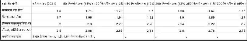 सरकार द्वारा जारी नए चार्ट के अनुसार, साधारण बस सेवा के लिए 50 कि०मी० तक की दूरी के लिए अब 1.71 रुपये प्रति कि०मी० की दर से किराया तय किया गया है, जो पहले 1.50 रुपये था । वहीं, डीलक्स बसों के लिए 50 कि०मी० की दूरी तक का किराया 1.96 रुपये प्रति कि०मी० निर्धारित किया गया है । जैसे-जैसे दूरी बढ़ेगी, प्रति किलोमीटर की दर में मामूली कमी आएगी। उदाहरण के लिए, 300 कि०मी० से अधिक की यात्रा पर साधारण बस का किराया 1.65 रुपये और डीलक्स का 1.87 रुपये प्रति कि०मी० होगा ।