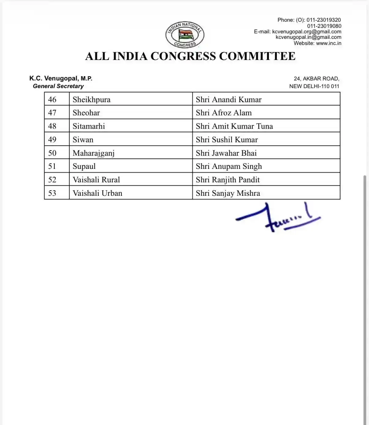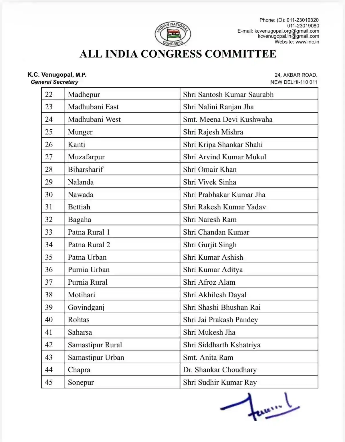 बिहार कांग्रेस में बड़ा फेरबदल: के.सी. वेणुगोपाल ने जारी की जिला अध्यक्षों की फाइनल लिस्ट, देखें किसे मिली कहाँ की कमान