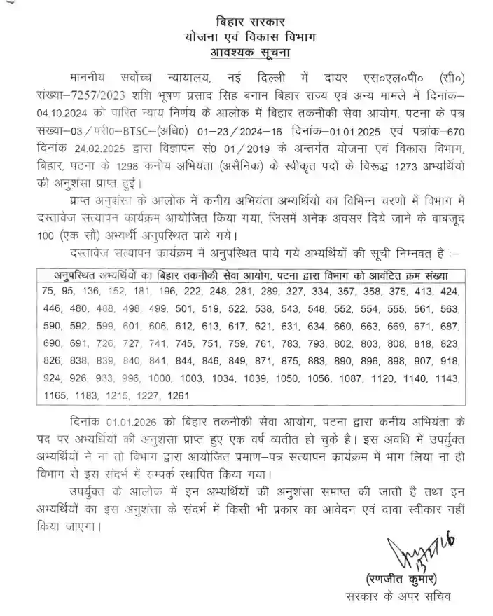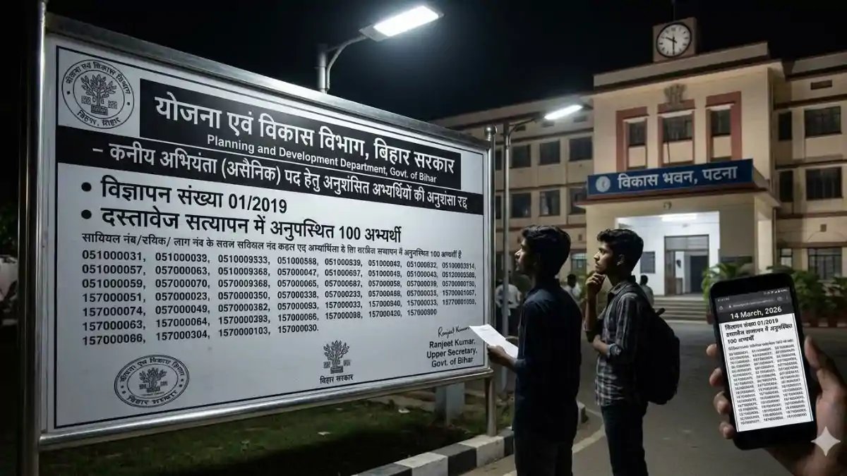 बिहार सरकार के योजना एवं विकास विभाग ने कनीय अभियंता (असैनिक) के पद पर अनुशंसित 100 अभ्यर्थियों की अनुशंसा रद्द कर दी है। लंबे समय तक दस्तावेज सत्यापन प्रक्रिया में अनुपस्थित रहने के कारण विभाग ने यह सख्त कदम उठाया है।