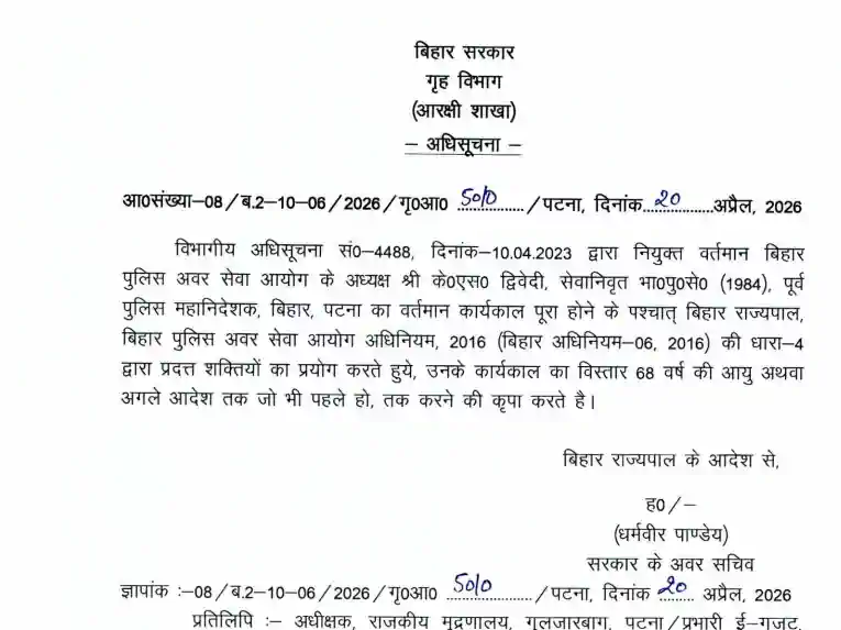 बिहार सरकार ने पूर्व DGP के.एस. द्विवेदी का कार्यकाल 68 वर्ष की आयु तक बढ़ा दिया है। वे बिहार पुलिस अवर सेवा आयोग (BPSSC) के अध्यक्ष पद पर बने रहेंगे। पढ़ें गृह विभाग की नई अधिसूचना।