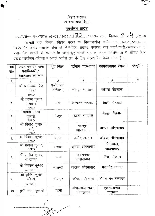 Bihar Panchayat Service Transfers 2026 - बिहार पंचायत सेवा में बड़ा फेरबदल: 10 बीपीआरओ और व्याख्याताओं का प्रशासनिक तबादला