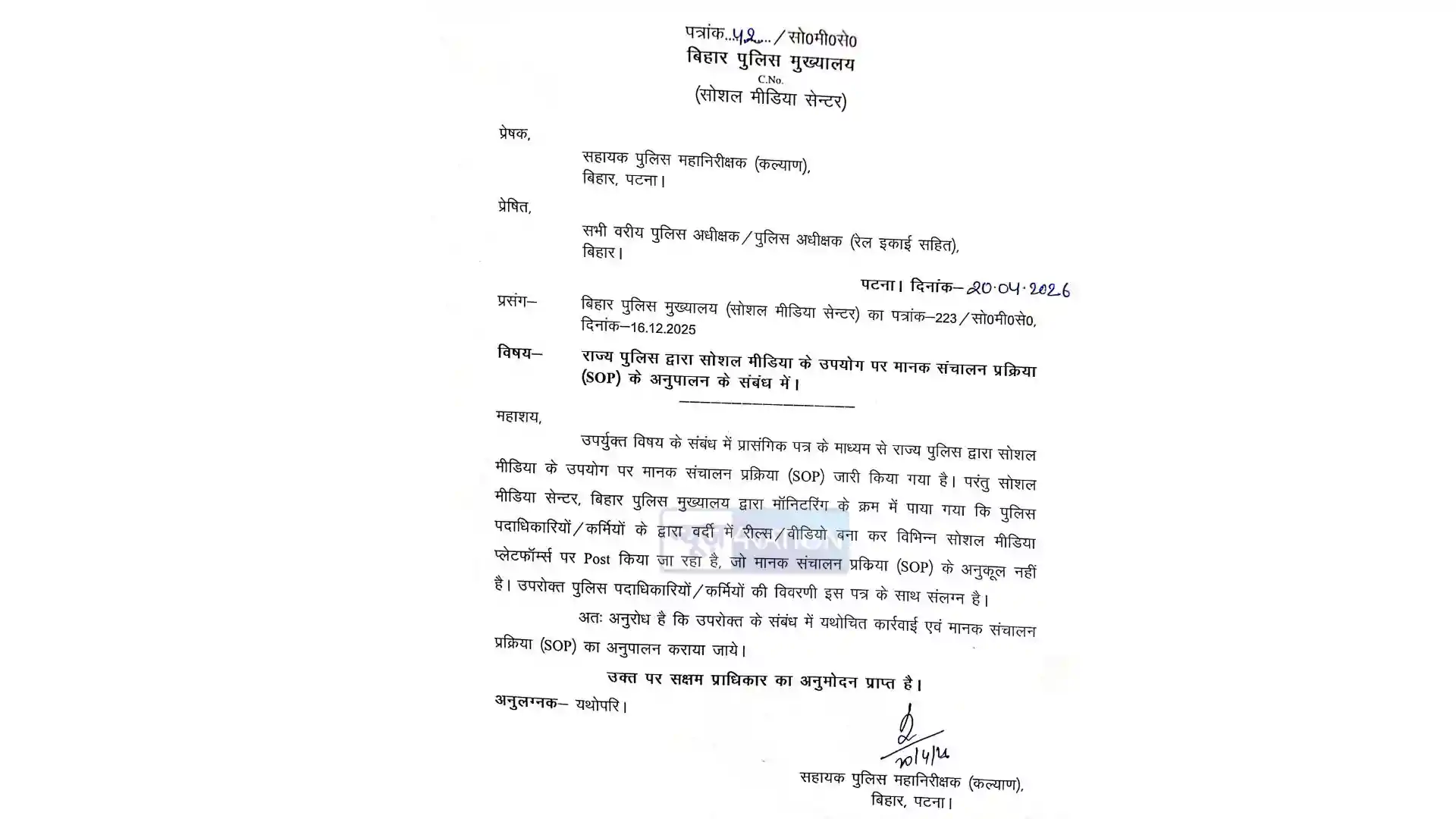 बिहार पुलिस मुख्यालय ने सोशल मीडिया पर वर्दी पहनकर रील्स और वीडियो बनाने वाले पुलिस अधिकारियों और कर्मियों के खिलाफ सख्त रुख अख्तियार किया है। मुख्यालय के सोशल मीडिया सेंटर द्वारा की गई मॉनिटरिंग में यह बात सामने आई है कि कई पुलिसकर्मी मानक संचालन प्रक्रिया (SOP) का उल्लंघन कर रहे हैं। इस संबंध में सहायक पुलिस महानिरीक्षक (कल्याण) ने राज्य के सभी वरीय पुलिस अधीक्षकों और पुलिस अधीक्षकों को पत्र जारी कर कार्रवाई के निर्देश दिए हैं।