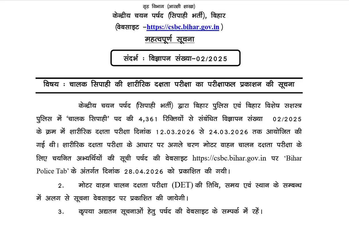 Bihar Police Driver Constable Recruitment : बिहार पुलिस में चालक सिपाही भर्ती प्रक्रिया से जुड़ी बड़ी अपडेट मंगलवार को सामने आई है। चालक सिपाही भर्ती के लिए केंद्रीय चयन पर्षद (सिपाही भर्ती) ने शारीरिक दक्षता परीक्षा (PET) का परिणाम जारी कर दिया है। यह परिणाम विज्ञापन संख्या 02/2025 के तहत जारी किया गया है। पर्षद के अनुसार, बिहार पुलिस और बिहार विशेष सशस्त्र पुलिस में चालक सिपाही के 4,361 पदों पर भर्ती के लिए आयोजित PET परीक्षा 12 मार्च 2026 से 24 मार्च 2026 तक पटना के गर्दनीबाग स्थित शहीद राजेंद्र प्रसाद सिंह राजकीय उच्च विद्यालय (पटना हाई स्कूल) में कराई गई थी।