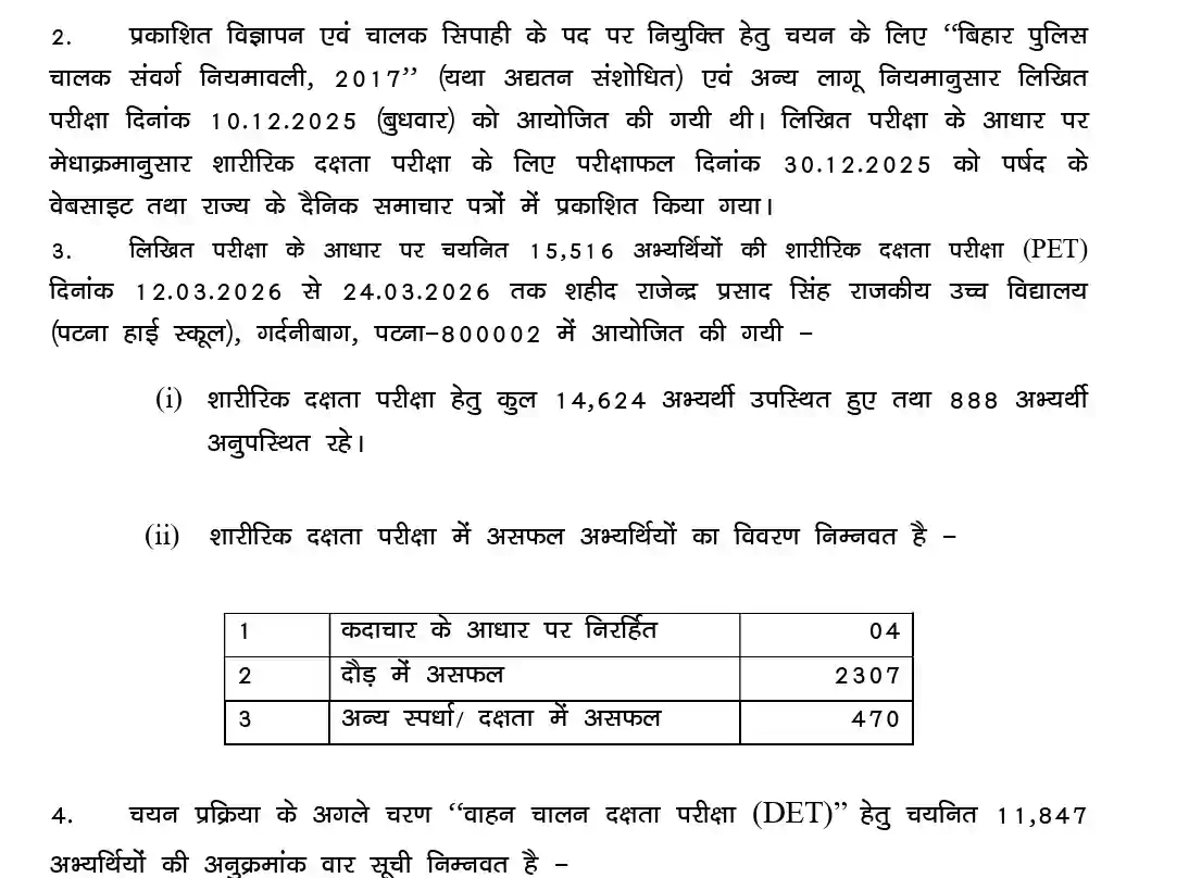 PET के आधार पर कुल 11,847 अभ्यर्थियों को अगले चरण, यानी मोटर वाहन चालन दक्षता परीक्षा (DET) के लिए चयनित किया गया है। चयनित उम्मीदवारों की सूची पर्षद की आधिकारिक वेबसाइट पर है.