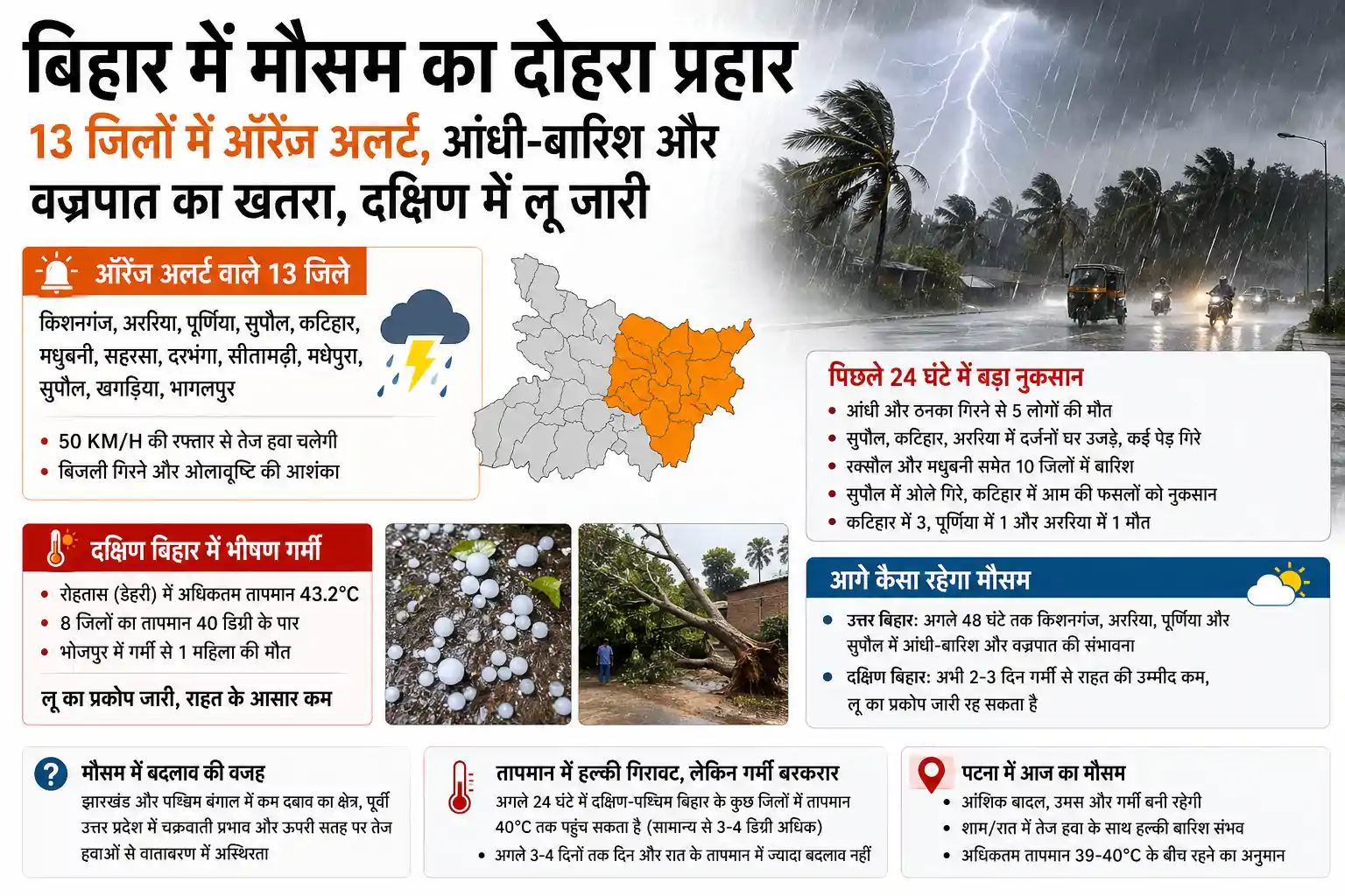 Bihar Weather: बिहार में इन दिनों मौसम का मिजाज बदला बदला नजर आ रहा है। कई जिलों में भीषण गर्मी तो कई जिलों में झमाझम बारिश हो रही है। रविवार को कई जिलों में बारिश दर्ज की गई। वहीं आज यानी सोमवार को मौसम विभाग ने 13 जिलों में आंधी, बारिश और वज्रपात को लेकर ऑरेंज अलर्ट जारी किया है। इन इलाकों में 50 किलोमीटर प्रति घंटे की रफ्तार से तेज हवाएं चलने, बिजली गिरने और ओलावृष्टि की आशंका जताई गई है।