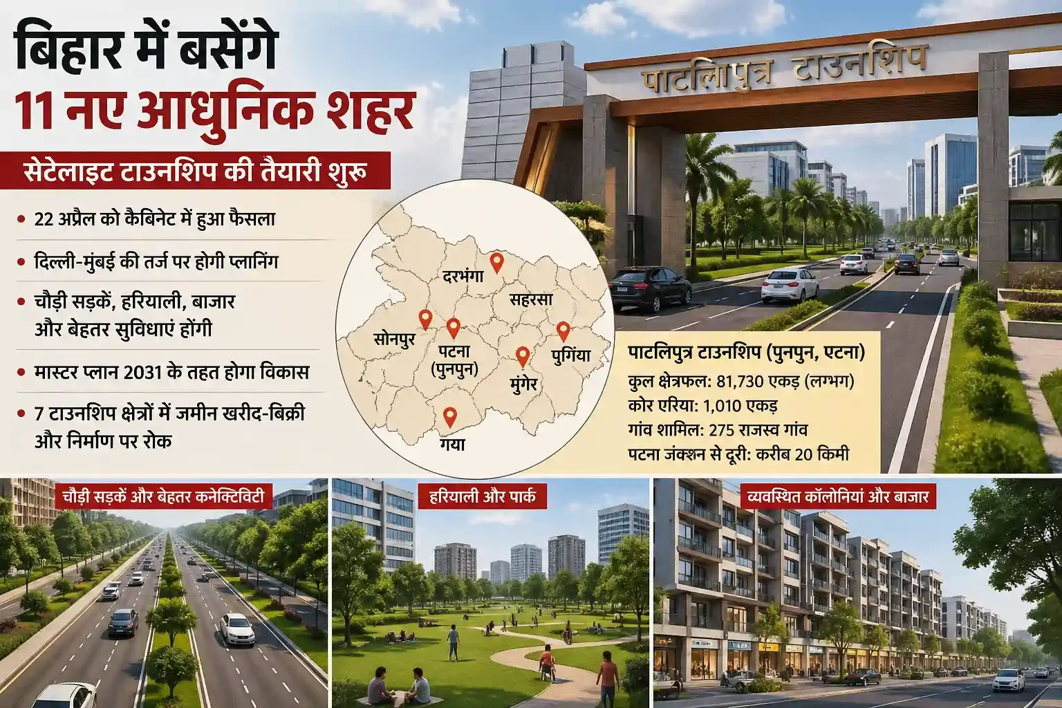इन योजनाबद्ध शहरों के निर्माण से राज्य में नए आर्थिक केंद्र विकसित होंगे, जिससे रोजगार और निवेश के अवसर बढ़ेंगे। साथ ही बड़े शहरों पर आबादी का दबाव कम होगा और नागरिकों को बेहतर शहरी सुविधाएं मिलेंगी। सेटेलाइट टाउनशिप बड़े शहरों के आसपास बसाए जाने वाले प्लांड शहर जैसे नवी मुंबई होते हैं। यहां चौड़ी सड़कें, सुव्यवस्थित सेक्टर, हरित क्षेत्र और बेहतर कनेक्टिविटी होती है। बिहार में बनने वाली टाउनशिप भी इसी मॉडल पर विकसित की जाएंगी।
