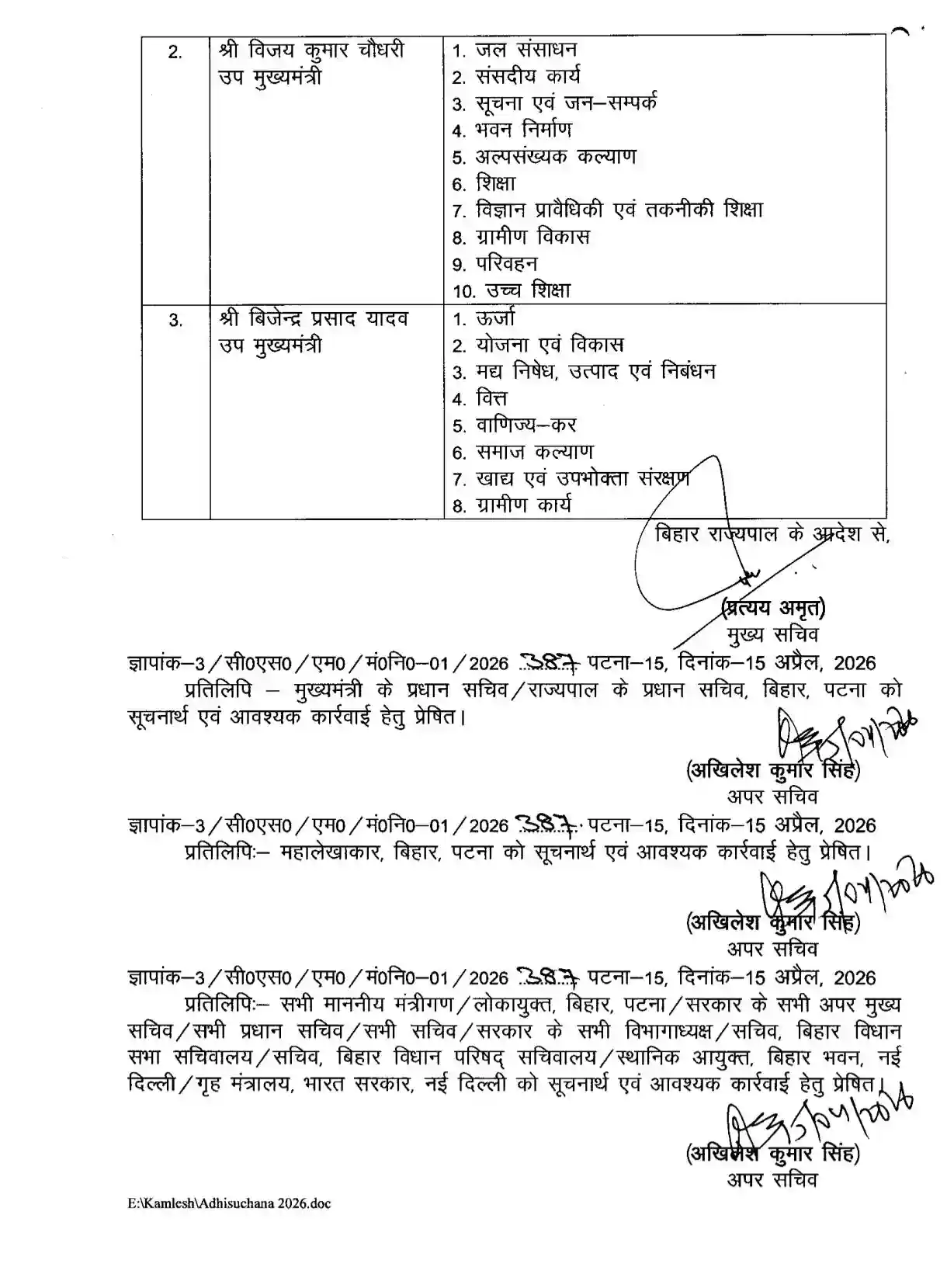 वहीं उपमुख्यमंत्री विजय चौधरी को 10 विभागों की जिम्मेदारी दी गई है। उनके पास जल संसाधन, शिक्षा, ग्रामीण विकास, संसदीय कार्य और परिवहन जैसे महत्वपूर्ण विभाग हैं। दूसरे उपमुख्यमंत्री विजेंद्र यादव को 8 विभाग सौंपे गए हैं, जिनमें ऊर्जा, वित्त, योजना एवं विकास, समाज कल्याण और वाणिज्य-कर जैसे प्रमुख विभाग शामिल हैं।