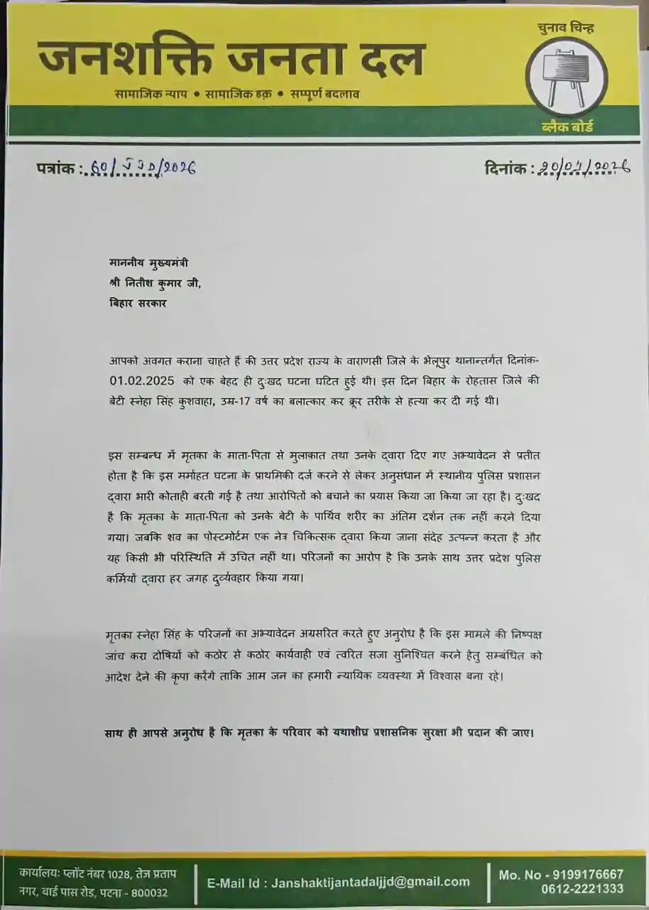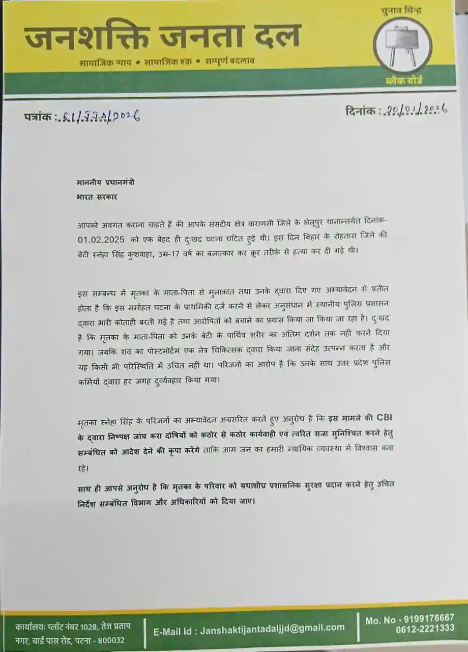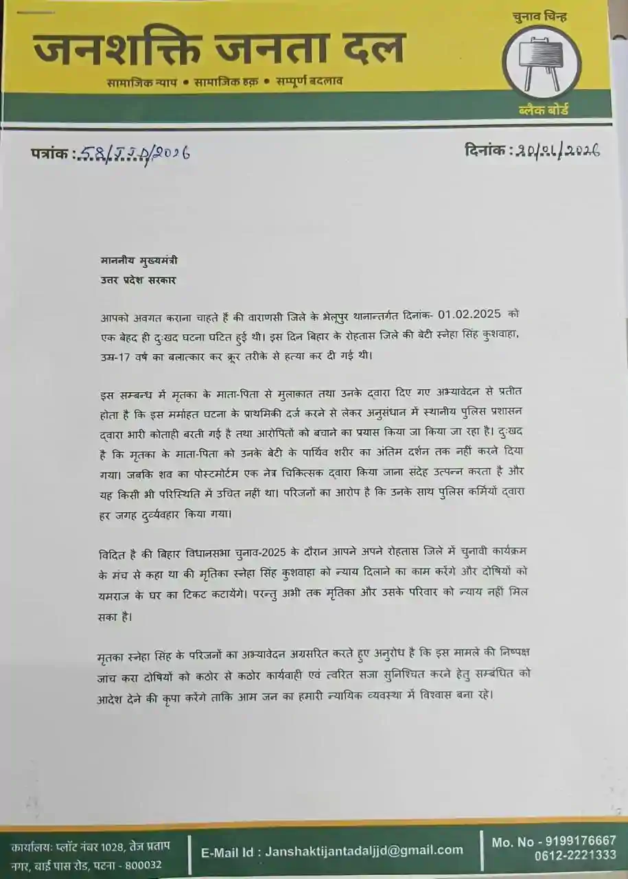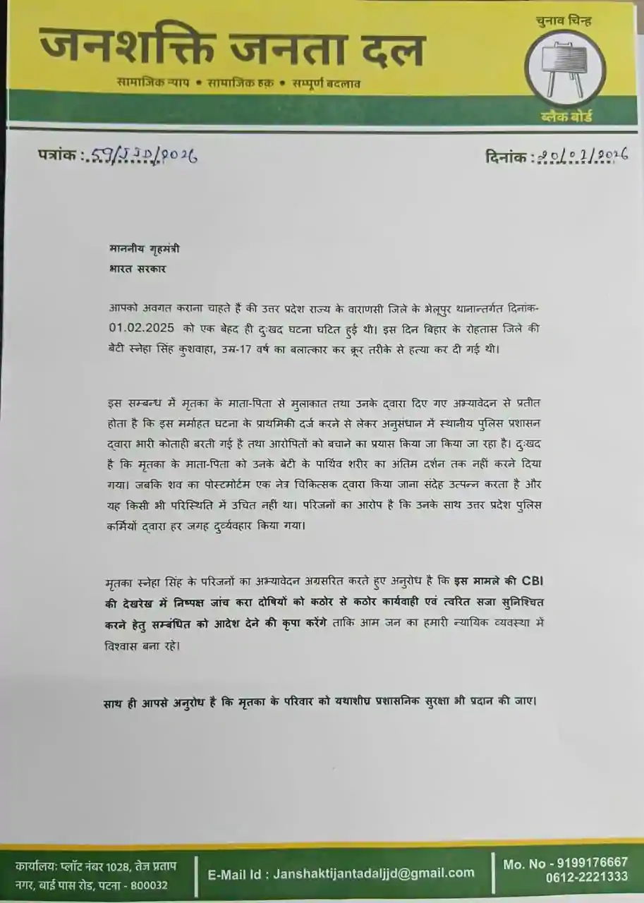 उन्होंने आगे कहा कि, इसे लेकर हमने उत्तर प्रदेश के मुख्यमंत्री, बिहार सरकार के मुख्यमंत्री, भारत सरकार के प्रधानमंत्री और भारत सरकार के गृहमंत्री को मृतका स्नेहा सिंह कुशवाहा और उसके परिजनों को न्याय दिलाने और निष्पक्ष जांच हेतु CBI की देखरेख में जांच की मांग किया है। साथ ही दोषियों पर कठोर कार्रवाई की मांग भी किया है। उन्होंने कहा कि, मुझे पूरी उम्मीद है बिहार सरकार, उत्तर प्रदेश सरकार एवं भारत सरकार इस मर्माहत कर देनी वाली घटना को ध्यान में रखते हुए उचित कार्रवाई करने की कृपा करेंगे।