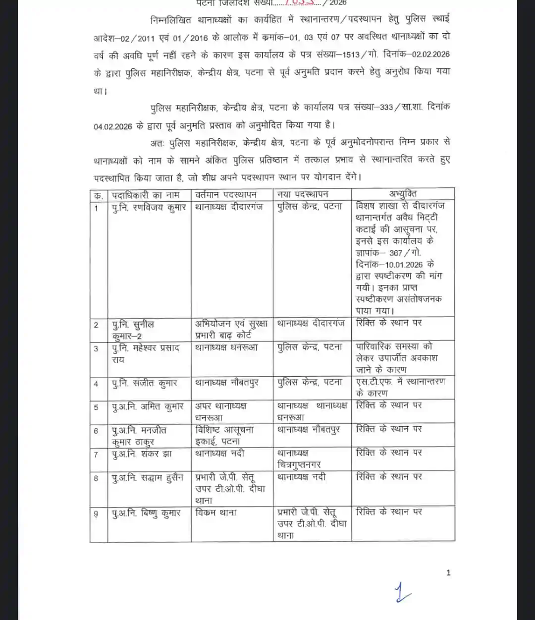 दस्तावेज़ के अनुसार, अन्य महत्वपूर्ण बदलावों में शंकर झा को नदी थाने से हटाकर चित्रगुप्तनगर का थानाध्यक्ष बनाया गया है। वहीं, सद्दाम हुसैन, जो पहले जे.पी. सेतु टी.ओ.पी. दीघा के प्रभारी थे, अब नदी थाने के नए थानाध्यक्ष होंगे। इसी क्रम में बिक्रम थाना से जुड़े विष्णु कुमार को जे.पी. सेतु टी.ओ.पी. का नया प्रभारी नियुक्त किया गया है। ये सभी नियुक्तियां थानों में रिक्त पदों को भरने और प्रशासनिक कार्यकुशलता बढ़ाने के लिए की गई हैं।
