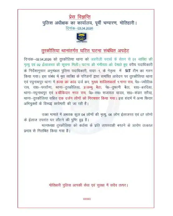 इस जहरीले नेटवर्क की जड़ तक पहुंचने के लिए पुलिस ने बड़ा ऑपरेशन चलाया, जिसमें कुख्यात शराब तस्कर नागा राय को उसके पूरे परिवार के साथ गिरफ्तार कर लिया गया। पुलिस के मुताबिक, नागा राय फैमिली गैंग के जरिए लंबे समय से अवैध शराब का कारोबार चला रहा था जहां हर सदस्य इस काले धंधे में शामिल था। मामले की गंभीरता का अंदाजा इसी से लगाया जा सकता है कि मृतकों के बयान के आधार पर तुरकौलिया थाना और रघुनाथपुर थाना में हत्या का केस दर्ज किया गया है। यानी यह सिर्फ हादसा नहीं, बल्कि एक साजिशन मौत का सौदा बन चुका है।