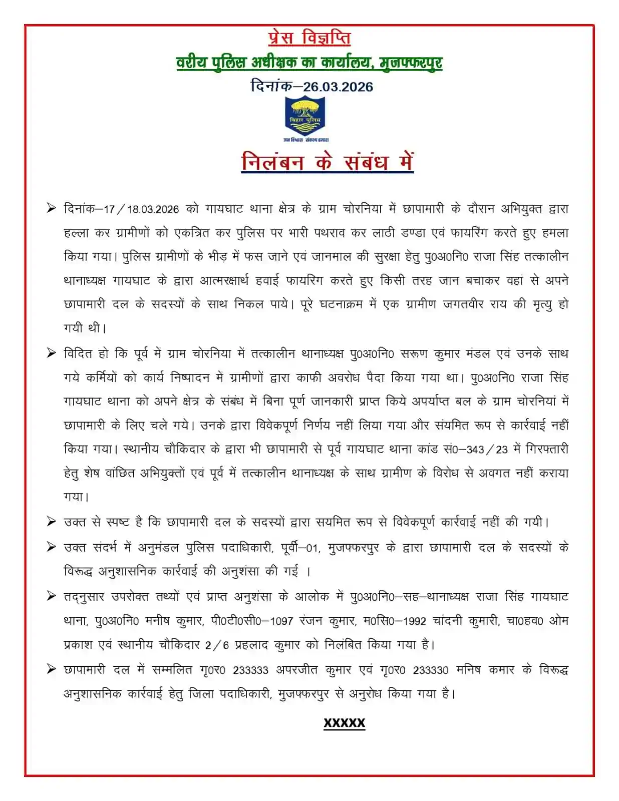 मुजफ्फरपुर के वरीय पुलिस अधीक्षक कांतेश कुमार मिश्रा ने राजा सिंह (तत्कालीन थानाध्यक्ष) समेत छह लोगों को निलंबित कर दिया गया है। इनमें पु०अ०नि० मनीष कुमार, पीटीसी-1097 रंजन कुमार, महिला सिपाही चांदनी कुमारी, चालक हया ओम प्रकाश और स्थानीय चौकीदार प्रहलाद कुमार शामिल हैं।