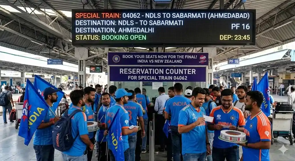 N4N Desk - टी20 वर्ल्ड कप 2026 के फाइनल मैच को लेकर देश भर में जबरदस्त उत्साह है। यह रोमांचक मुकाबला भारत और न्यूजीलैंड के बीच अहमदाबाद के नरेंद्र मोदी स्टेडियम में 8 मार्च को खेला जाएगा। इस महामुकाबले के लिए क्रिकेट प्रेमियों की भीड़ उमड़ रही है। इसी को ध्यान में रखते हुए, रेलवे ने दिल्ली और अहमदाबाद के बीच एक स्पेशल ट्रेन चलाने का फैसला किया है। यह ट्रेन क्रिकेट प्रशंसकों को अहमदाबाद पहुंचने में काफी मदद करेगी, खासकर उन लोगों के लिए जो महंगे हवाई टिकटों के कारण यात्रा करने से कतरा रहे थे।